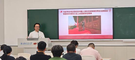 会议开始,全体教职工共同观看习近平总书记在纪念中国人民抗日战争暨世界反法西斯战争胜利80周年大会上的重要讲话视频,深刻感悟伟大抗战精神内涵,为后续学习与工作筑牢思想根基。